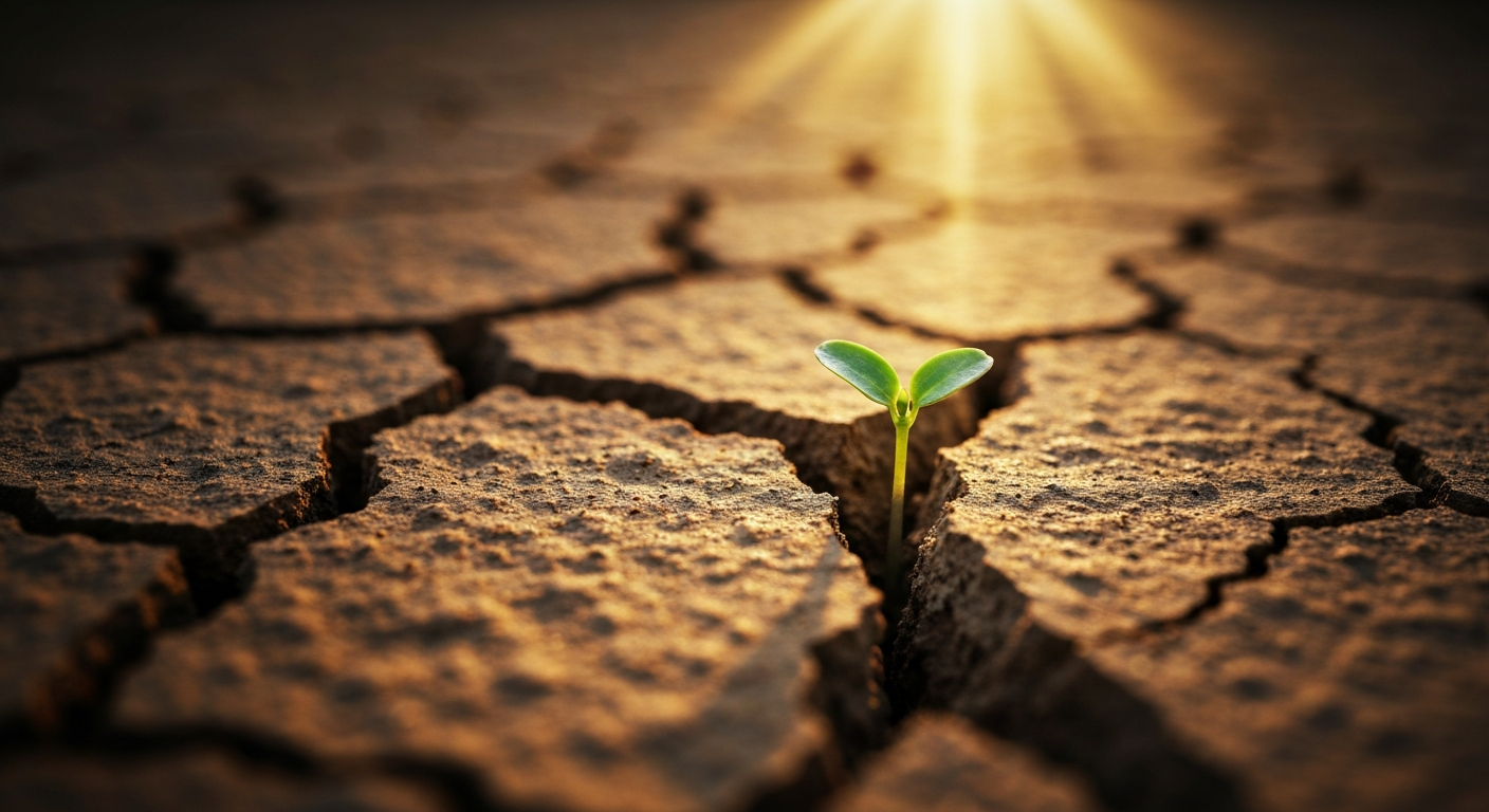 Klein groen plantje dat door droge aarde groeit in een zonnestraal