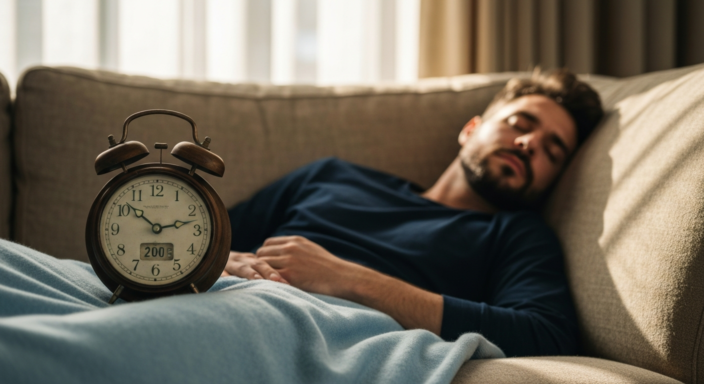 Persoon die een dutje doet op de bank met licht deken in middaglicht